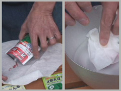 白いガーゼやネットなどに蒔く分の種を取り、包んで水に浸す。 -